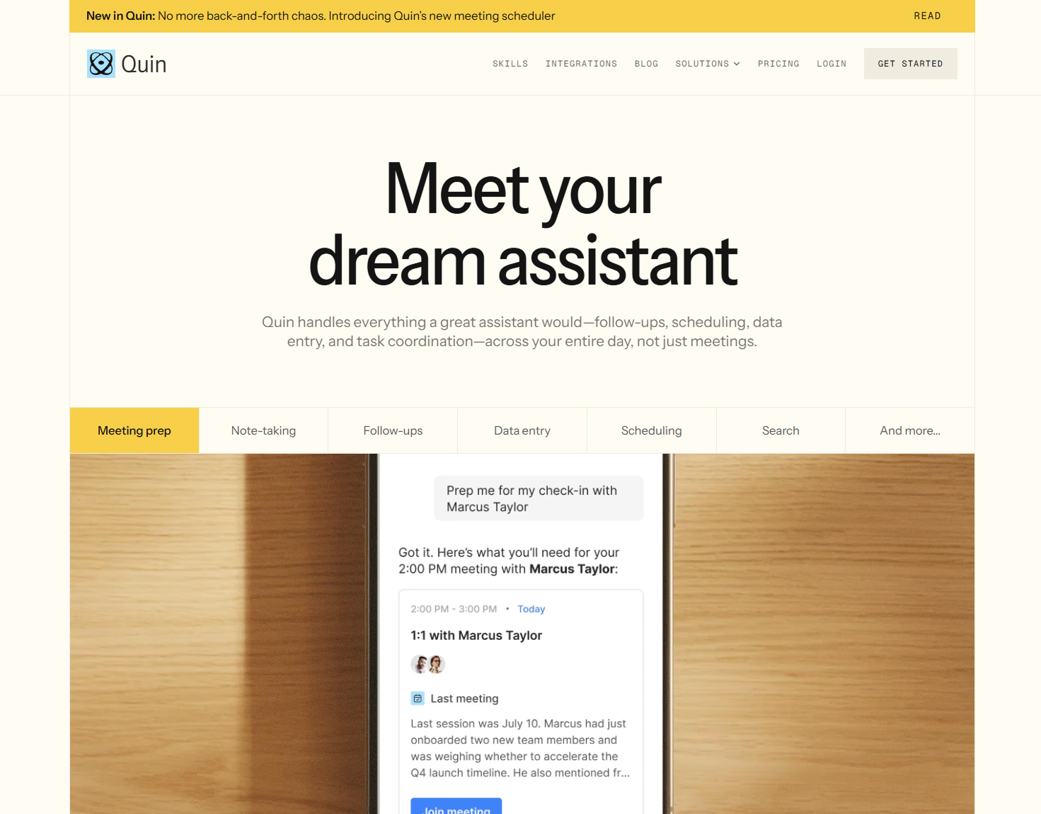 Quin. Светлый, аккуратный сайт ИИ-помощника с гармоничной модульной сеткой из плотных блоков без скруглений