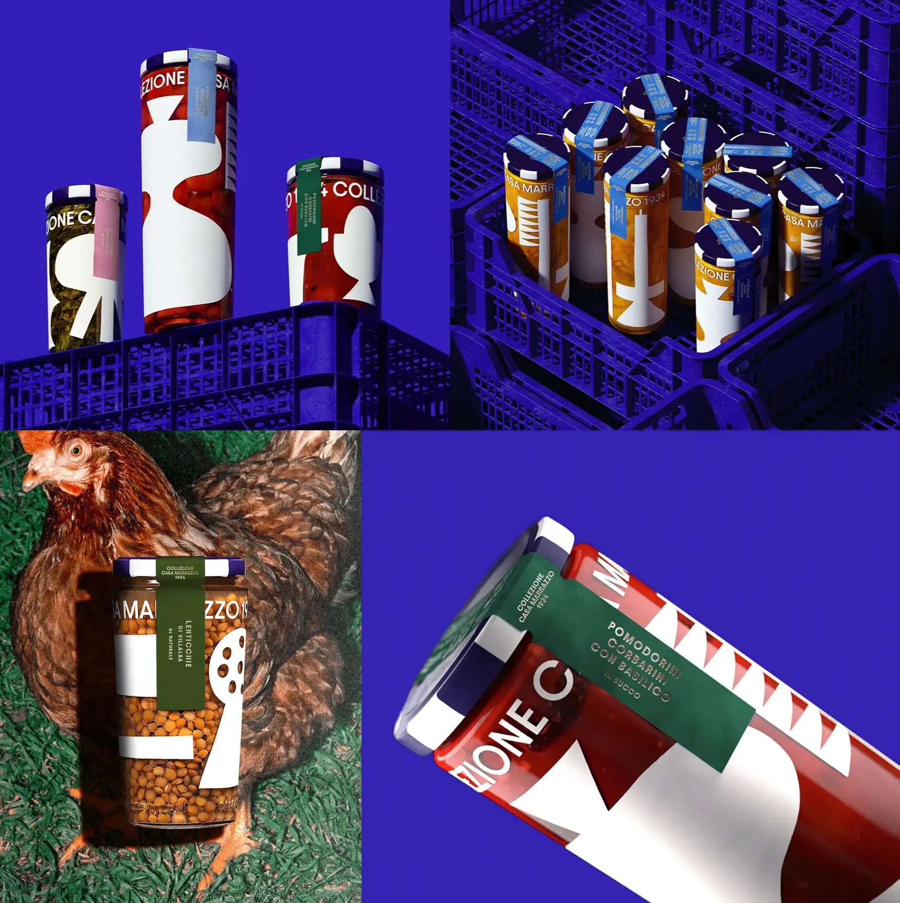 Современное оформление линейки натуральных консервов Casa Marrazzo 1934 с крупными геометричными иллюстрациями и выразительной вёрсткой.